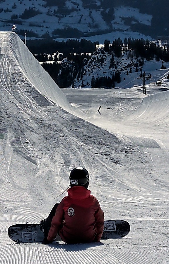 Laax. Andrina mit Blick auf die grösste & schönste Halfpipe der Welt