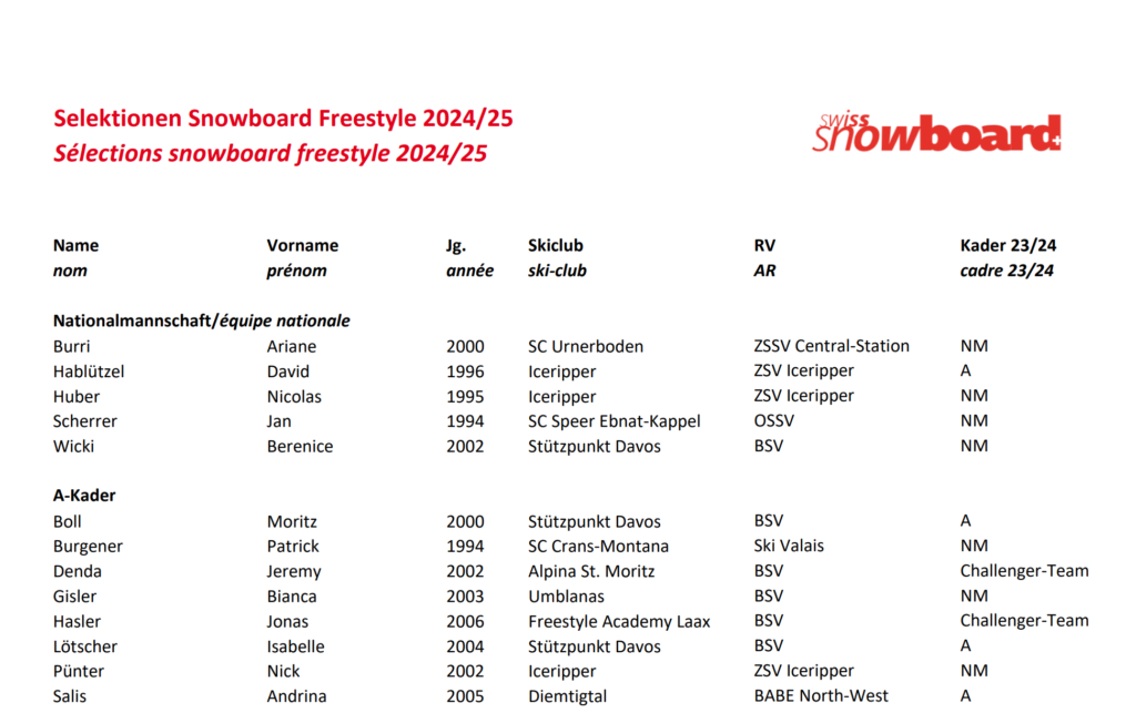 Kaderselektion von Swiss Snowboard Freestyle Saison 2024/2025: Selektioniert für das A Kader Posted on 27. Mai 2024 by wpadmin